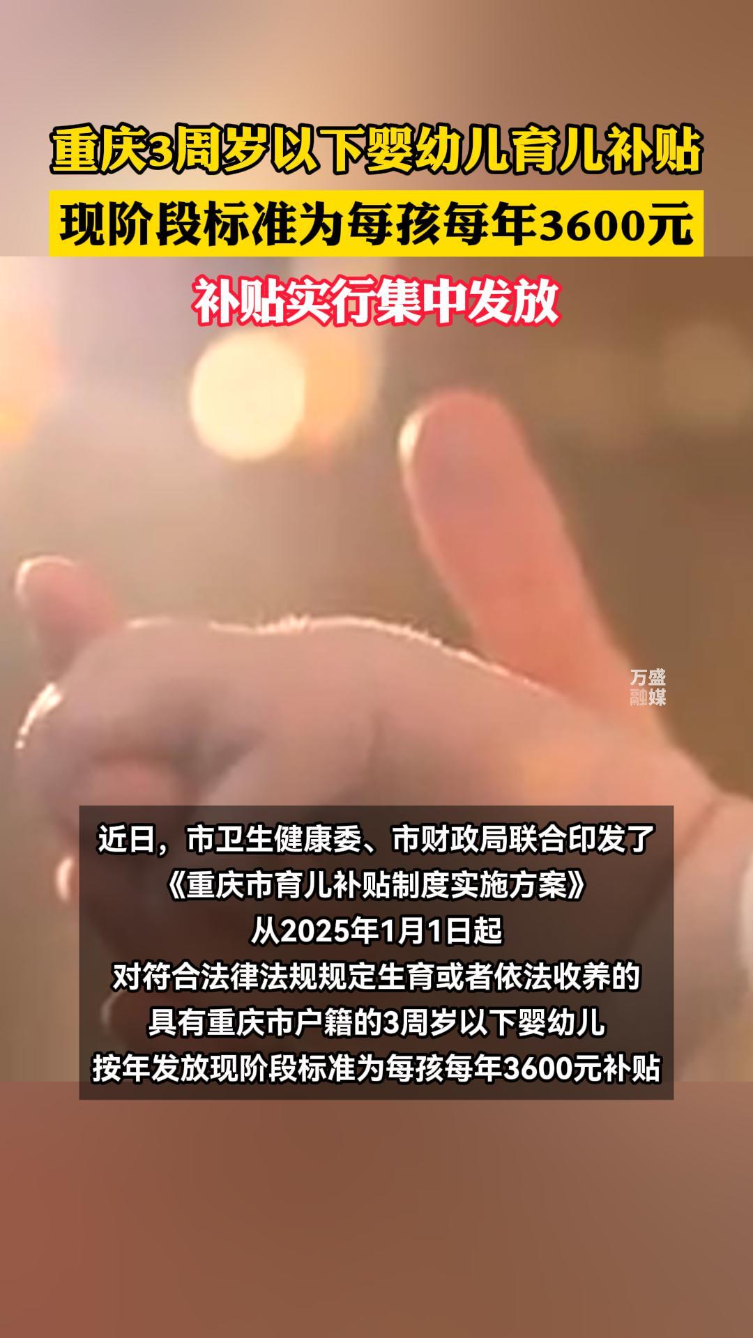 重庆3周岁以下婴幼儿育儿补贴现阶段标准为每孩每年3600元