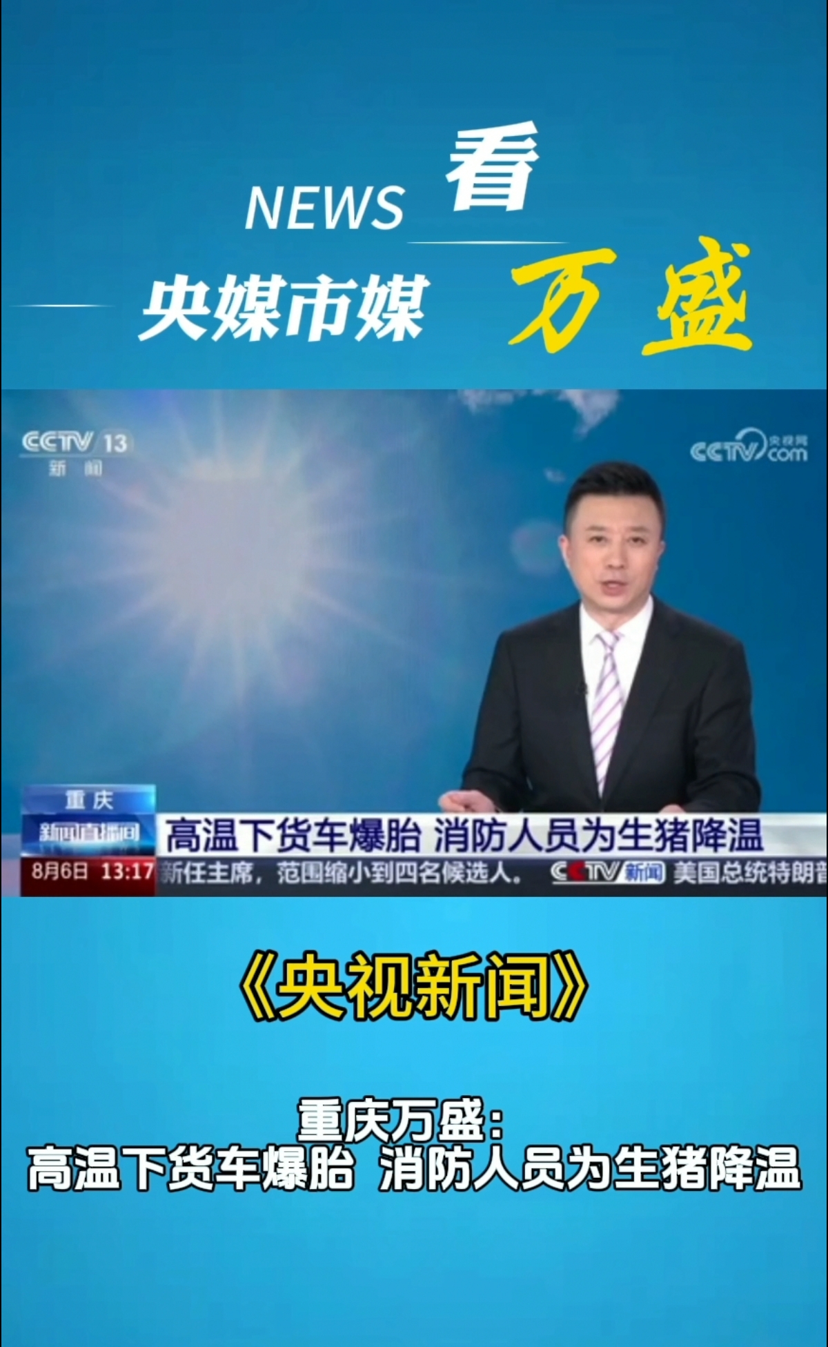 重庆万盛:高温下货车爆胎 消防人员为生猪降温